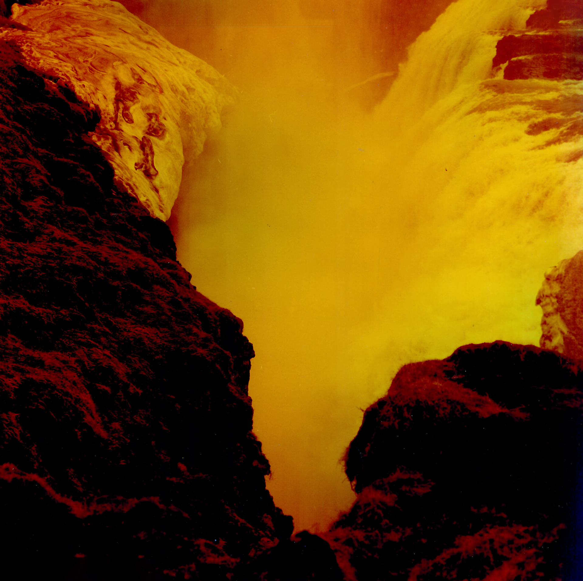 La série photographique Les Héliotropes investit cette pluralité sémantique, pour juxtaposer des paysages tournés vers une chaleur solaire prométhéenne à l’aune du réchauffement climatique, par l’usage d’un film couleur inversé redscale, et des silhouettes aveuglés par le flash, au seuil de l’aveuglement. Réalisé en partie dans les terres de feux islandaises, l’appareil photographique inverse la finalité de l’héliotrope optique, en enregistrant le rapport sensible humain-paysage sur des corps éblouis, peut-être inconscient d’une menace diffuse, en place du tracé scientifique initial. Le paysage apparait puissant et fragile à la fois, par les tonalités rouges-orangées d’une pellicule expérimentale, mais aussi par des actions paradoxales comme ce bloc de glace échoué sur les rives d’un estuaire, remodelé par la chaleur de la main de la photographe, avant de disparaitre, si ce n’est fixé par l’image.