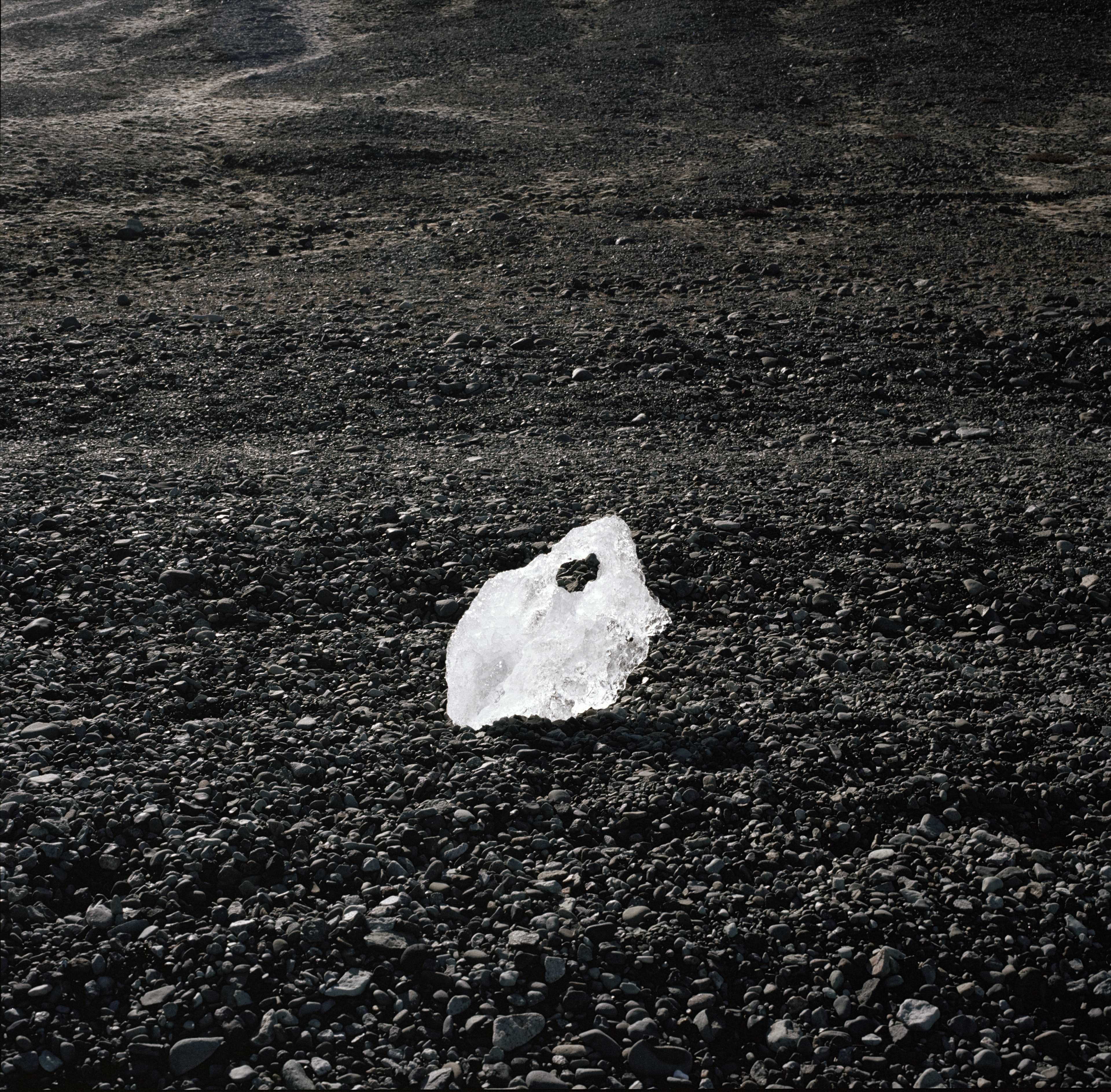 The photographic series Les Héliotropes explores this semantic plurality, juxtaposing landscapes bathed in Promethean solar heat in the context of global warming, through the use of redscale color reversal film, and silhouettes blinded by the flash, on the verge of blindness. Produced in part in Iceland's land of fire, the camera reverses the purpose of the optical heliotrope, recording the sensitive relationship between humans and landscape on dazzled bodies, perhaps unaware of a diffuse threat, in place of the initial scientific survey. The landscape appears both powerful and fragile, through the red-orange tones of experimental film, but also through paradoxical actions such as this block of ice washed up on the banks of an estuary, reshaped by the warmth of the photographer's hand before disappearing, if not fixed by the image itself.